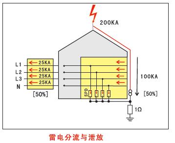 根據(jù)IEC62305-1,最大的測(cè)試?yán)纂娏鳛?00KA,當(dāng)它擊在建筑物的接閃裝置上,其中一半的雷電流會(huì)通過引下線直接入地,其余一半的雷電流會(huì)通過與建筑連接的線纜向建筑物中泄放。對(duì)于一個(gè)三相TN-C-S系統(tǒng),其電源進(jìn)線為4線,平均每線分流為25KA。因此,若對(duì)電源系統(tǒng)做防雷保護(hù)時(shí),采用放電電流能力為25KA(10/350us)的雷電電涌保護(hù)器就已經(jīng)足夠了。